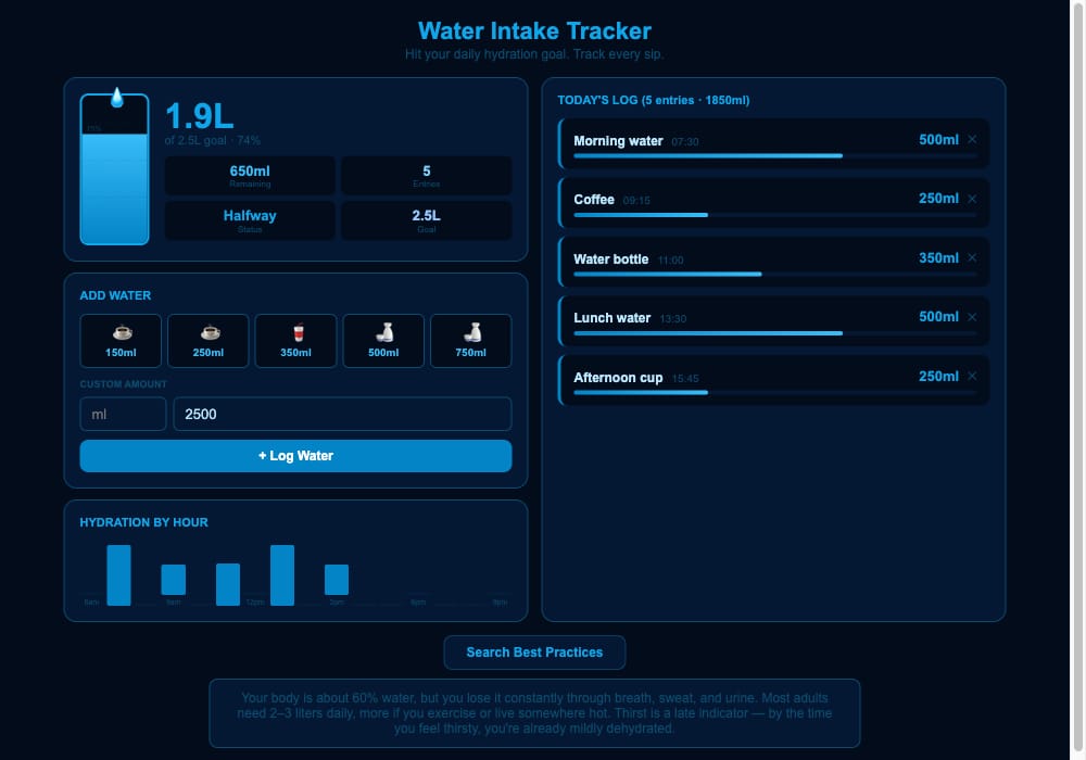 This app tracks every drink you log throughout the day. Set your daily water goal, tap a quick button for common amounts like a cup or bottle, or enter a custom ml value. The water tank fills as you approach your goal, the hourly chart shows when you’ve been most hydrated, and the running log on the right tracks every entry with timestamps.