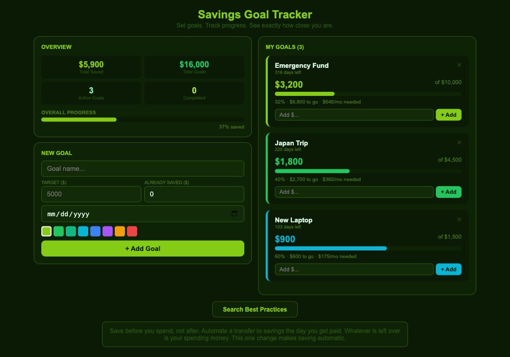 Seeing all your goals at once changes how you save. Each goal shows the exact monthly amount you need to stay on track. The “Add $” button on each goal lets you log deposits and watch the progress bar grow. Having a Japan Trip goal sitting at 40% is weirdly more motivating than having $1,800 sitting in a generic savings account.