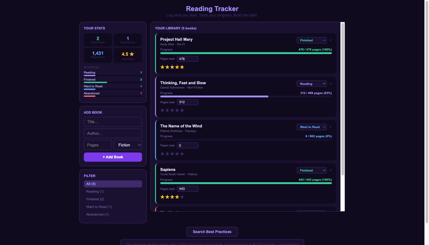 Build a reading tracker app in React. Let users add books with title, author, page count, and genre. For each book, show a progress bar with a page counter they can update, a status dropdown (Reading, Finished, Want to Read, Abandoned), and a 5-star rating system. Display summary stats: books read, currently reading, total pages read, and average rating. Include a filter panel to view books by status. Use a dark purple theme with a clean card layout.What this does: Tracks your reading list with progress bars for each book, lets you log how many pages you've read, marks books as finished when you reach the last page, and shows your total pages read and average rating across your whole library.