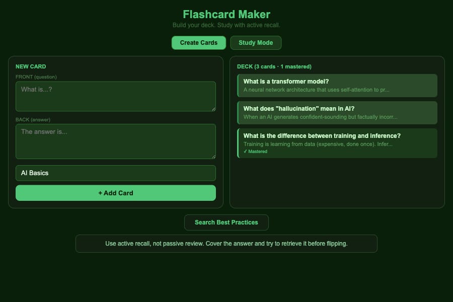 Builds a complete study tool you can actually use. Create cards with questions and answers, organize them into a named deck, then flip to study mode to test your recall. Mark cards you know as “Got it” and they drop out of your study queue. The progress bar shows mastered vs. remaining at a glance.