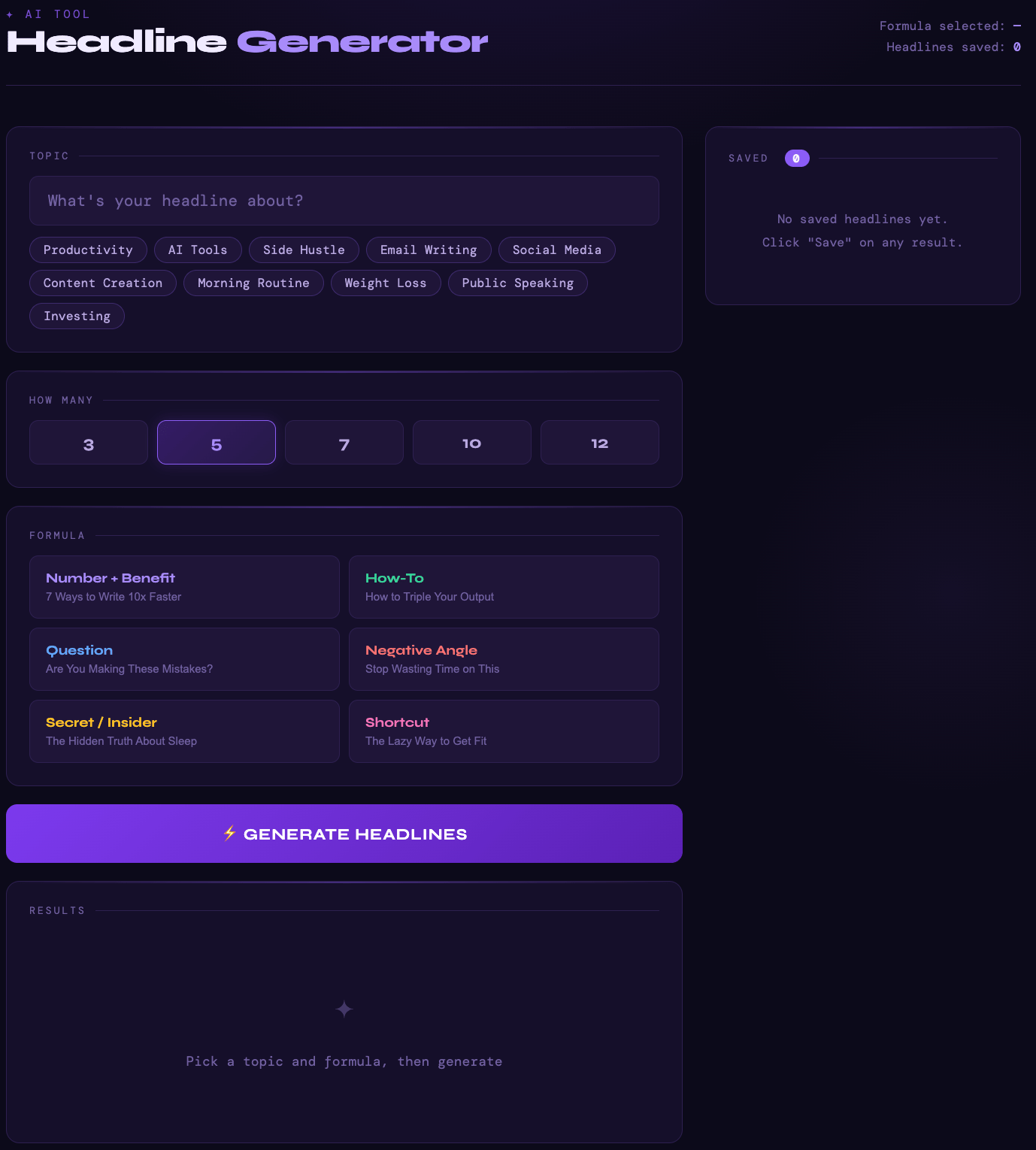 Build a headline generator app. Features: topic input with example chips, number picker (3/5/7/10/12), 6 formula buttons (Number+Benefit, HowTo, Question, Negative, Secret, Shortcut), save headlines with 5-star ratings. Dark purple theme. 900px wide.iWhat this does: